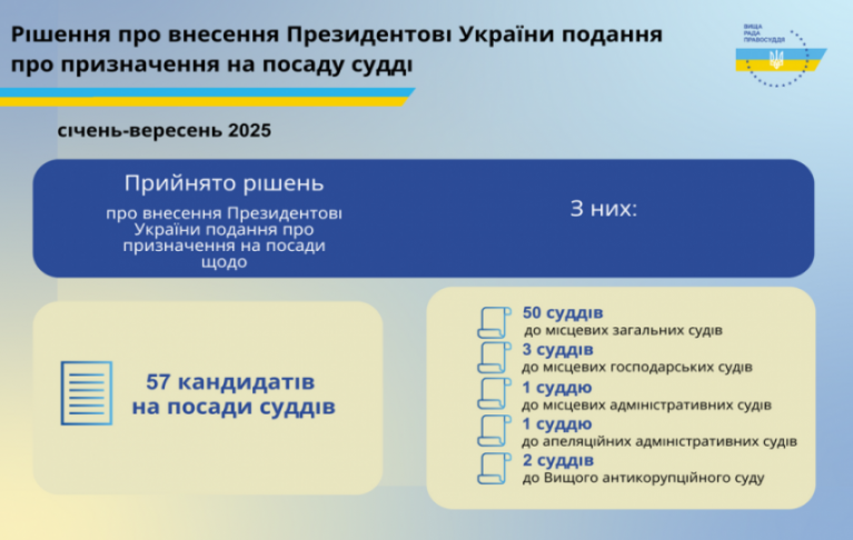 Вища рада правосуддя протягом січня – вересня 2025 року прийняла рішення про внесення Президентові України подання про призначення 57 кандидатів на посади суддів, з них: