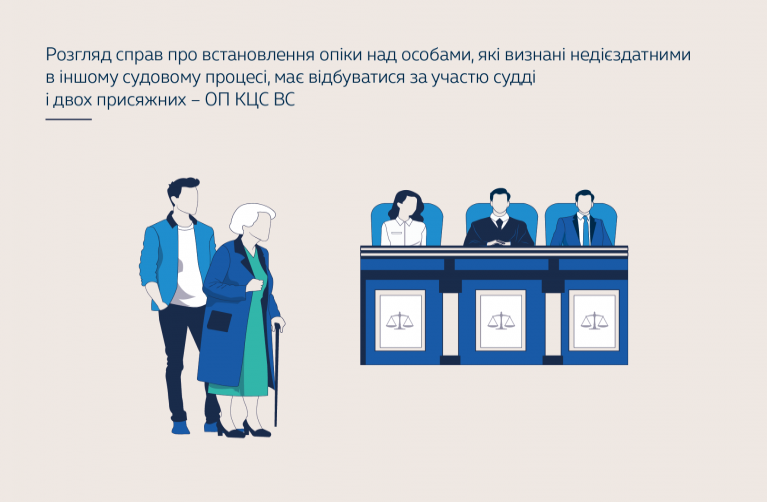 З огляду на викладене ОП КЦС ВС виснувала, що вимоги про встановлення опіки, призначення опікуна чи співопікуна, заміну опікуна або співопікуна, звільнення від повноважень опікуна, які вирішуються після вирішення вимоги про визнання фізичної особи недієздатною в іншому судовому процесі, підлягають розгляду судом першої інстанції у складі одного судді і двох присяжних.