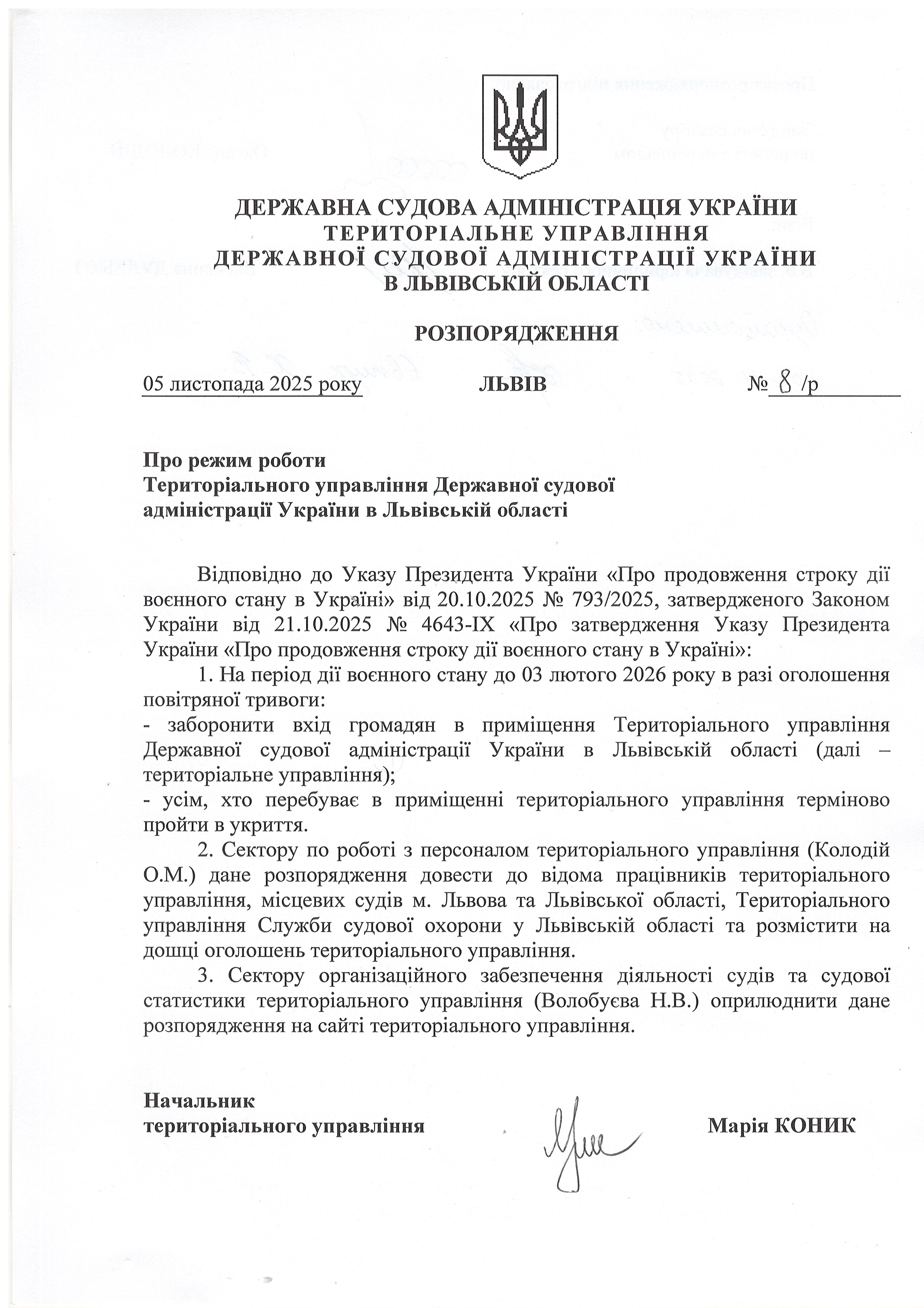 Розпорядження про режим роботи Територіального управління Державної судової адміністрації України в Львівській області №8/р від 05.11.2025