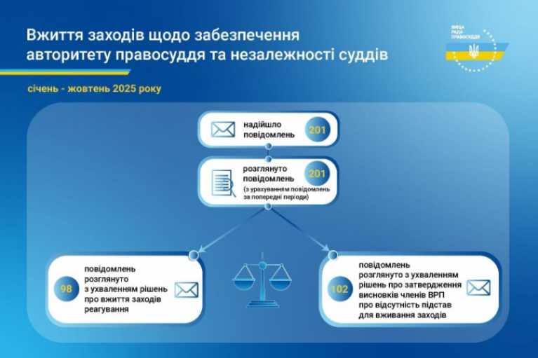 Упродовж десяти місяців 2025 року ВРП розглянула 201 повідомлення про втручання у професійну діяльність суддів