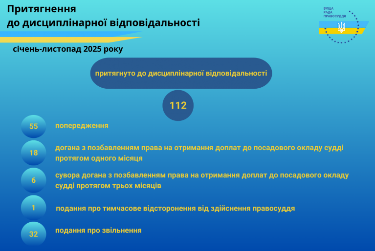 За результатами розгляду дисциплінарних справ протягом січня - листопада 2025 року Дисциплінарні палати Вищої ради правосуддя прийняли 109 рішень про притягнення до дисциплінарної відповідальності 112 суддів та застосування до них таких видів дисциплінарних стягнень: