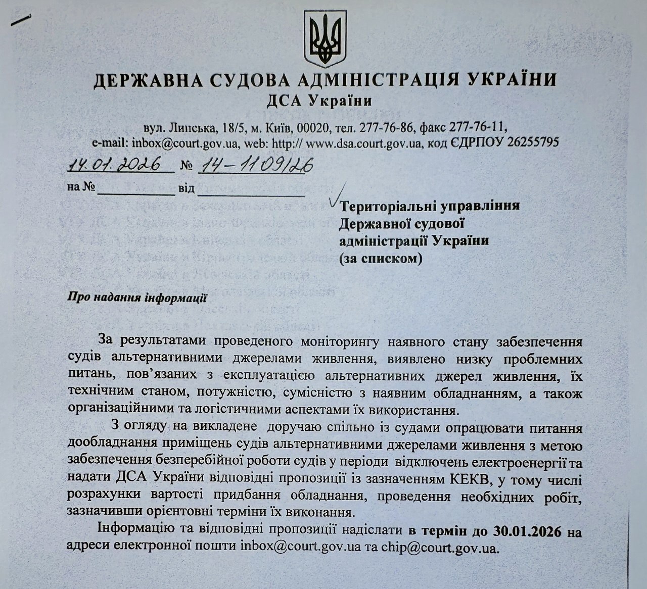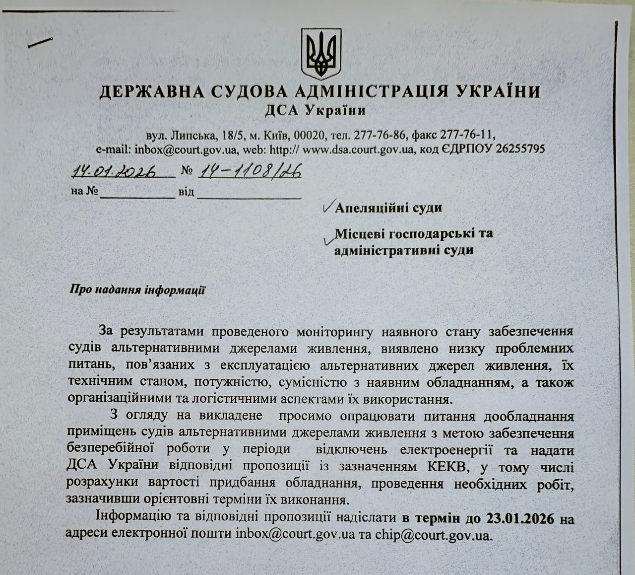 Державна судова адміністрація України звернулася до апеляційних, місцевих господарських та адміністративних судів із запитом щодо опрацювання питання дообладнання приміщень установ альтернативними джерелами живлення. Це необхідно для забезпечення безперебійної роботи у періоди відключень електроенергії. Суди мають надати відповідні пропозиції із зазначенням КЕКВ, розрахунки вартості придбання обладнання та проведення необхідних робіт, а також орієнтовні терміни їх виконання.