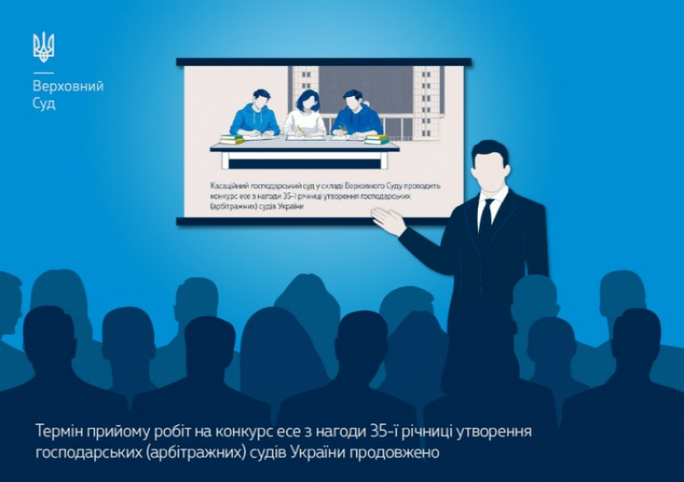 З огляду на звернення закладів вищої освіти, а також враховуючи складні безпекові умови – часті повітряні тривоги, дистанційний формат навчання та перебої з електропостачанням, що впливають на освітній процес, Касаційний господарський суд у складі Верховного Суду вирішив подовжити термін прийому творчих робіт (есе у формі наукового дослідження) на тему «Цінності та принципи господарського судочинства: європейський вектор розвитку» в межах конкурсу, який приурочено до 35-ї річниці утворення господарських (арбітражних) судів України.