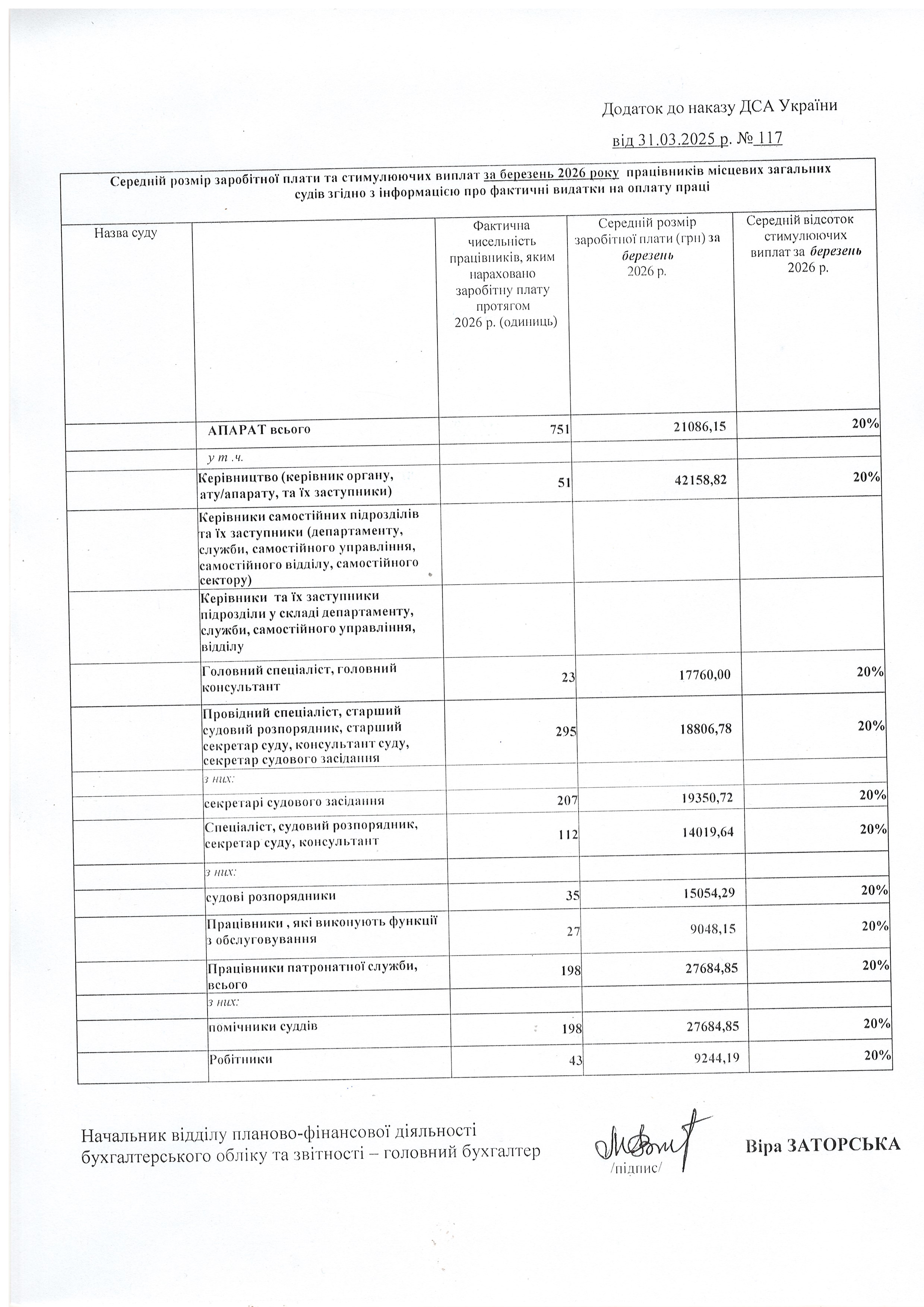Середній розмір заробітної плати та стимулюючих виплат за березень 2026 року працівників місцевих загальних судів згідно з інформацією про фактичні видатки на оплату праці