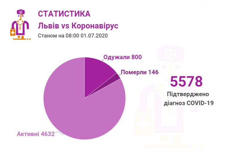 Станом на 01 липня у Львові та Львівській області загалом коронавірусну інфекцію виявлено — у 5578 осіб, 146 людей померло. 800 пацієнтів одужало.