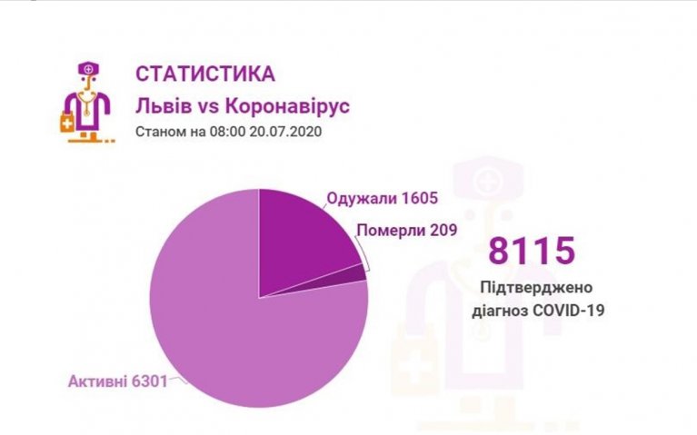 Станом на 20 липня у Львові та Львівській області загалом коронавірусну інфекцію виявлено —у 8115 осіб, 209 людей померло. 1605 пацієнтів одужало.