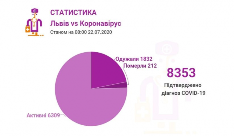 Станом на 22 липня у Львові та Львівській області загалом коронавірусну інфекцію виявлено — у 8353 осіб, 212 людей померло. 1832 пацієнти одужало.