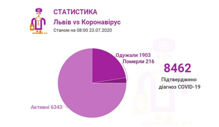 Станом на 23 липня у Львові та Львівській області загалом коронавірусну інфекцію виявлено — у 8462 осіб, 216 людей померло. 1903 пацієнти одужало.