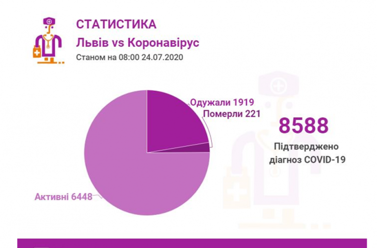 Станом на 24 липня у Львові та Львівській області загалом коронавірусну інфекцію виявлено- у 8588 осіб, 221 людина померла. 1919 пацієнтів одужало.