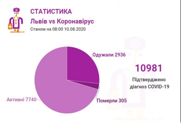 Станом на 10 серпня у Львові та Львівській області загалом коронавірусну інфекцію виявлено — у 10981 особи, 305 людей померли. 2936 пацієнтів одужало.