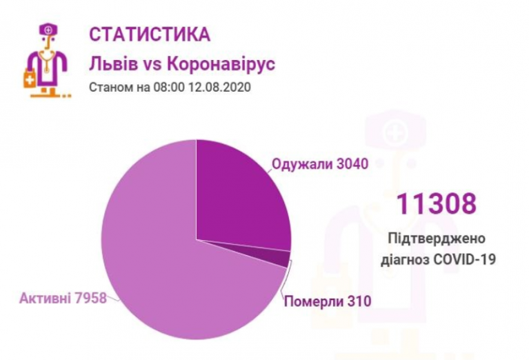 Станом на 12 серпня у Львові та Львівській області загалом коронавірусну інфекцію виявлено — у 11308 осіб, 310 людей померли. 3040 пацієнтів одужало.