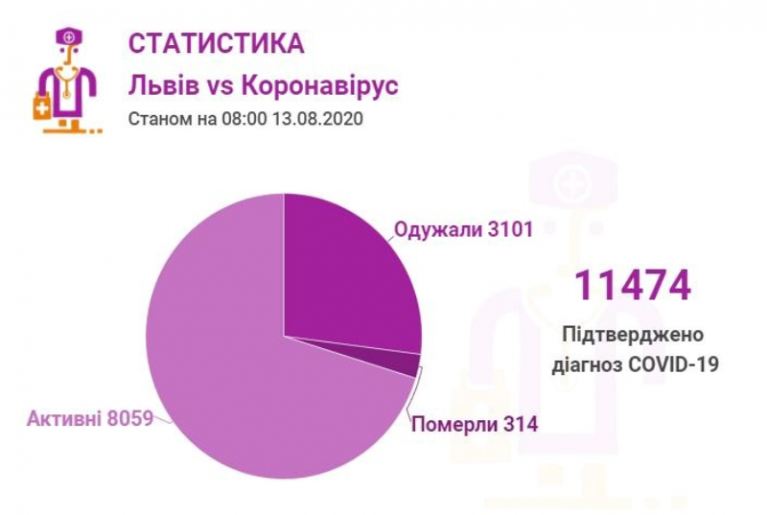 Станом на 13 серпня у Львові та Львівській області загалом коронавірусну інфекцію виявлено — у 11474 осіб, 314 людей померли. 3101 пацієнт одужав.