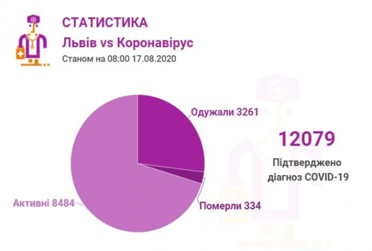 Станом на 17 серпня у Львові та Львівській області загалом коронавірусну інфекцію виявлено — у 12079 осіб, 334 людини померли. 3261 пацієнт одужало.