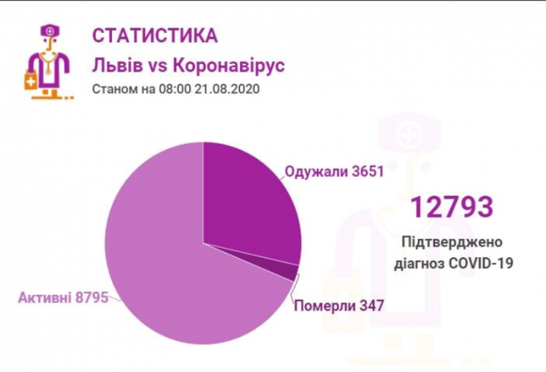 Станом на 21 серпня у Львові та Львівській області загалом коронавірусну інфекцію виявлено — у 12793 осіб, 347 людей померли. 3651 пацієнт одужав.