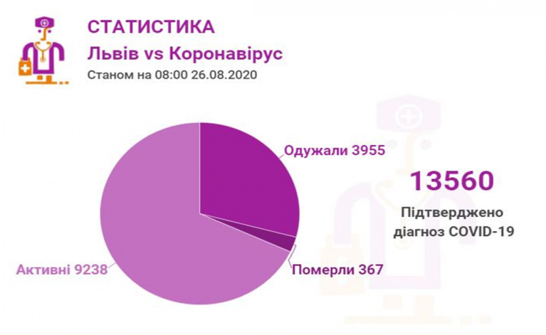 Станом на 26 серпня у Львові та Львівській області загалом коронавірусну інфекцію виявлено— у 13560 осіб, 367 людей померли. 3955 пацієнтів одужало.