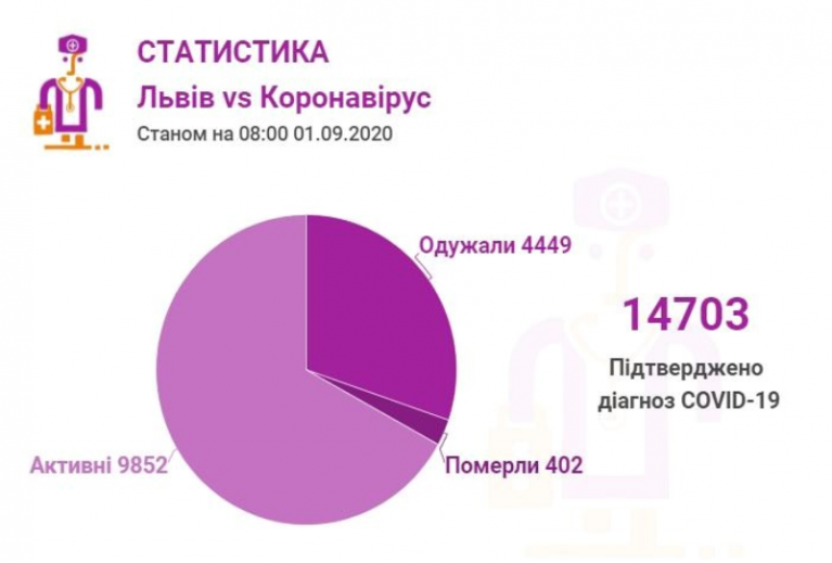 Станом на 01 вересня у Львові та Львівській області Загалом коронавірусну інфекцію виявлено — у 14703 осіб, 402 людини померли. 4449 пацієнтів одужало.