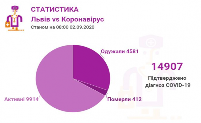 Станом на 02 вересня у Львові та Львівській області Загалом коронавірусну інфекцію виявлено— у 14907 осіб, 412 людей померли. 4581 пацієнт одужав.