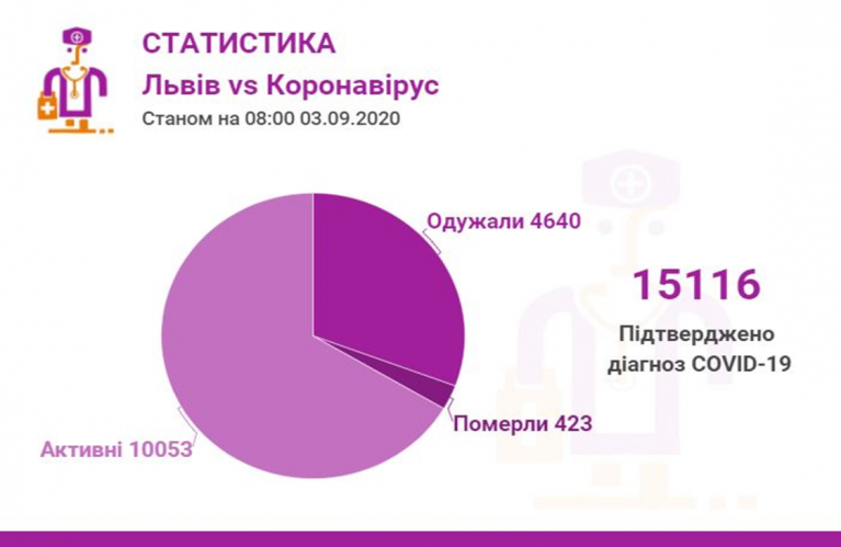 Станом на 03 вересня у Львові та Львівській області Загалом коронавірусну інфекцію виявлено— у 15116 осіб, 423 людини померли. 4640 пацієнтів одужало.