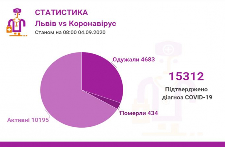 Станом на 04 вересня у Львові та Львівській області Загалом коронавірусну інфекцію виявлено— у 15312 осіб, 434 людини померли. 4683 пацієнти одужало.