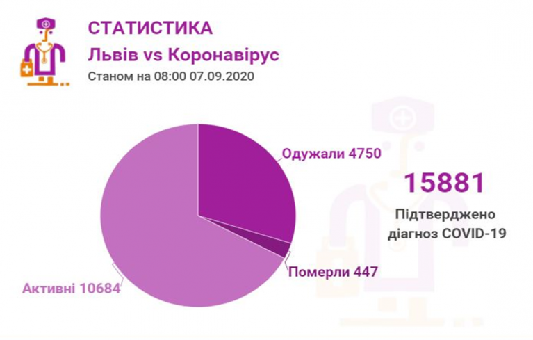Станом на 08 вересня у Львові та Львівській області загалом коронавірусну інфекцію виявлено— у 15881 особи, 447 людей померли. 4750 пацієнтів одужало.