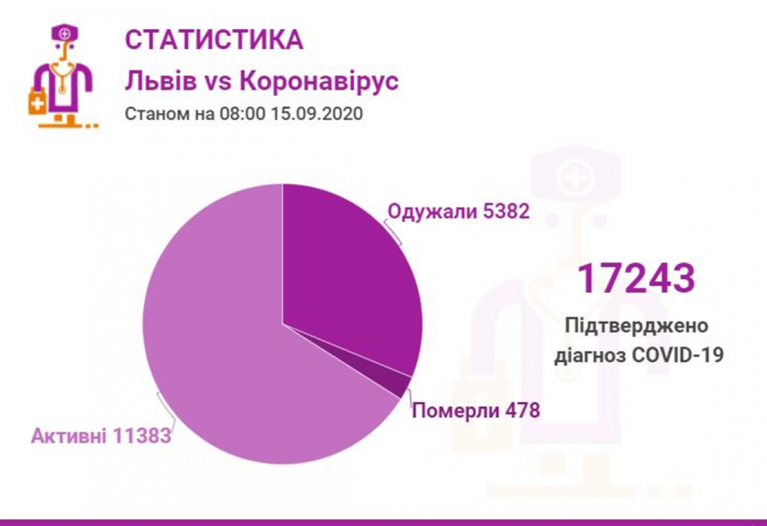 Станом на 15 вересня у Львові та Львівській області загалом коронавірусну інфекцію виявлено— у 17243 осіб, 478 людей померли. 5382 пацієнти одужало.