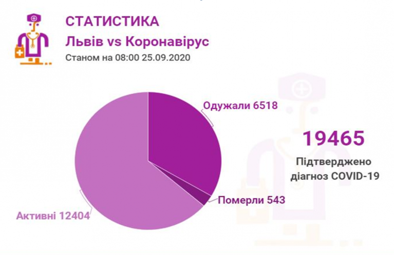 Станом на 25 вересня у Львові та Львівській області загалом коронавірусну інфекцію виявлено— у 19465 осіб, 543 людини померли, 6518 пацієнтів одужало.