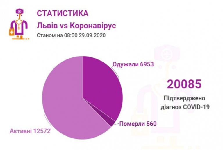 Станом на 29 вересня у Львові та Львівській області загалом коронавірусну інфекцію виявлено — у 20085 осіб, 560 людей померли. 6953 пацієнти одужало.
